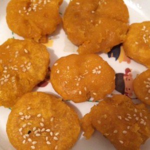 放油适量下锅,油滚后放南瓜饼,炸至金黄,还有柔软度的时候捞起~小心热油飞溅哟~