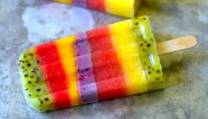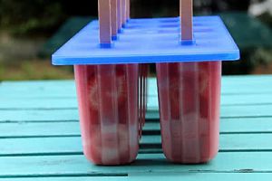 草莓切片,放入模具,倒入果酱,插上冰棒