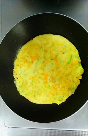 待油稍热,倒入一勺面糊,用木铲将面糊铺满锅底,小火煎