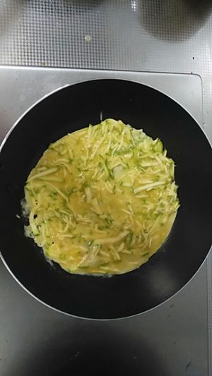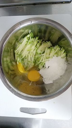 将西葫芦细丝放入面盆中,打入两颗鸡蛋,倒入适量面粉,洒入适量的盐