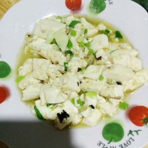 锅里放油,豆腐放进去煎一会,反过来煎一会,放葱蒜翻炒,加入盐,调味料(我加的太太乐)即可。