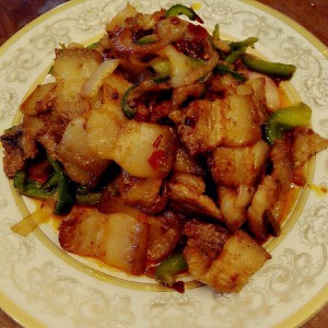 第六步:放入辣椒和洋葱,炒1~2分钟,根据个人对甜椒软硬的喜好。(甜椒可以提前焯一下水)