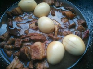放几个鸡蛋在里面,水煮蛋,也可以放鹌鹑蛋,大火烧开,转小火慢炖,2小时以上,最后大火收汁。翻滚吧!红烧肉!