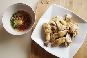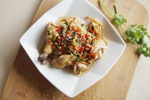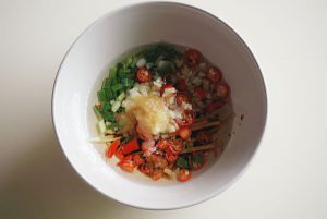 鸡肉蒸烤的时间我们来做调料,将葱姜蒜和小米椒切碎放入碗中加盐和鸡粉淋入热油到少许酱油拌均匀备用
