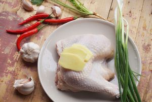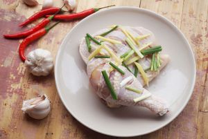 鸡肉洗净用刀划上小口切几段葱和姜撒在上面静置15分钟去除腥味