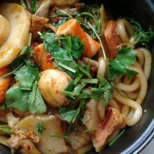放入肉类和不好熟的蔬菜翻炒,加入适量火锅底料(我用的是德庄清油火锅底料),加入一点温水,一点点就可以,不要倒太多。