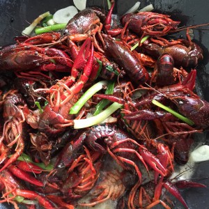 小龙虾下锅,待不动后,放干辣椒、花椒。