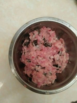 把紫菜,肉,豆粉,盐,鸡精(少许)放入碗里一起搅拌。