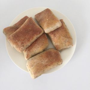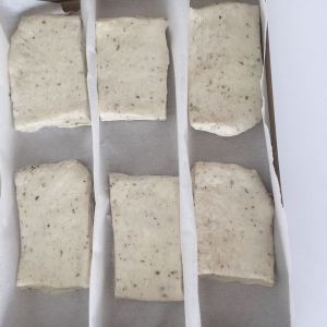 把面团擀成饼饼,切块,放烤盘,发酵原来厚度的一倍