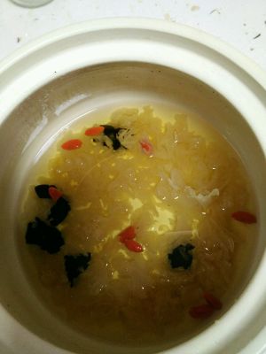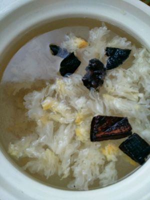 纯净水+银耳+灵芝入砂锅,煮,水开后文火煮两小时