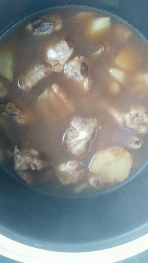 排骨连汤倒入电饭锅。按下煮饭健。
