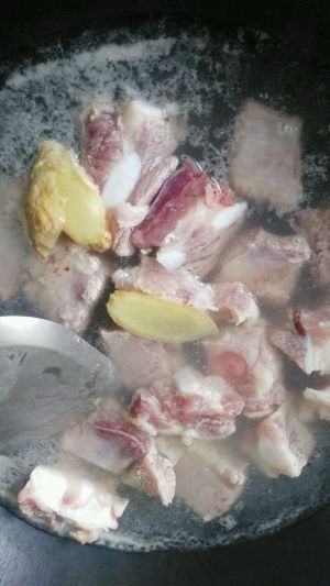 锅中烧水,水开,放入排骨,姜片,料酒。煮五分钟。捞出,洗净碎骨头。