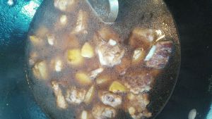 煎好的排骨和土豆翻炒一下,加入一大勺生抽,一大勺老抽,一大勺耗油,一小勺白糖,一丁点盐翻炒均匀,加入跟菜齐平的清水。