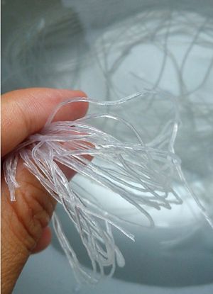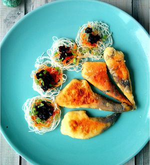 煎鱼的同时,将龙口粉丝泡在冷水中,稍软后在手上绕成圈