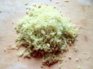 焯好水的柚子皮用刀刮一刮切成细丝再切几刀,稍微小一些就可以。