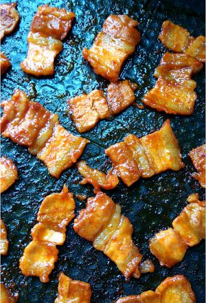 电饼铛或者铁板烤盘上刷油(配料外)后,将腌好的五花肉一片片展开铺在上面