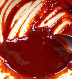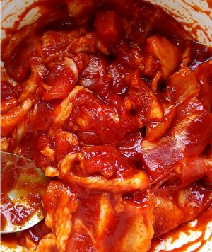 将韩式辣酱、料酒、生抽、糖、植物油、姜粉、胡椒粉拌匀。无需加盐,因为韩式辣酱中有咸味