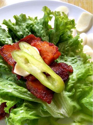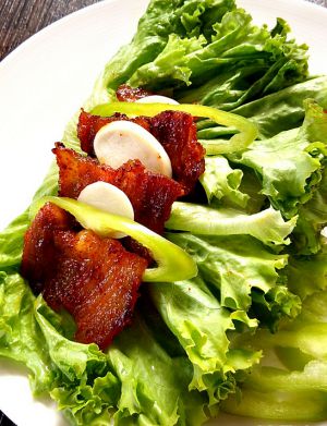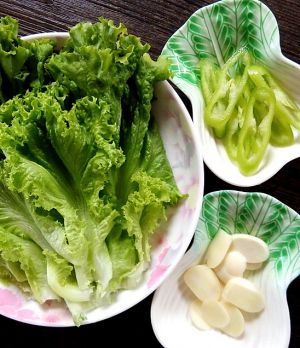 趁腌肉的时候,洗净生菜叶,蒜切片,尖椒切圈