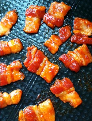 一面煎熟之后,刷少许油,翻面继续小火煎烤。烤到稍有焦痕,肥肉中的油脂被烤出来的时候最香,关火就行了