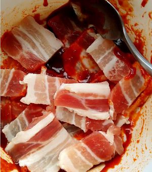 把切好的五花肉片放入腌料中,拌匀,保证每一片肉的每一面都黏上了腌料