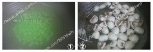 青豆、胡萝卜洗净,胡萝卜去皮切丁。锅内坐水,滴几滴油,水开后下青豆氽水,捞出过冷河沥干备用。蘑菇洗净后去蒂,一分为四切成蘑菇块,沸水中氽烫,捞出沥水备用。