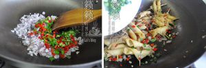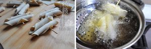 将豆皮控干水分,分切成小方块,卷成筒状用牙签串起来;起油锅,六成热油将豆皮炸至酥香金黄,捞出控油备用。