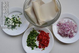 洋葱洗净切末;红╱青尖椒去蒂去籽切丁备用;小葱切末备用;豆皮用热盐水浸泡一会,去除豆腥味。