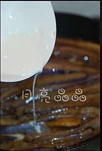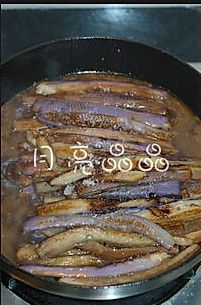 放入煎好的茄条,加半汤匙老抽,再加点白砂糖,煮沸后转小火盖上盖子煮两分钟,加一点点盐和鸡精调好味。