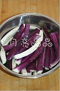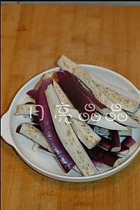 茄子用淡盐水浸泡洗净后,切成长条,泡在清水里,至少15分钟。