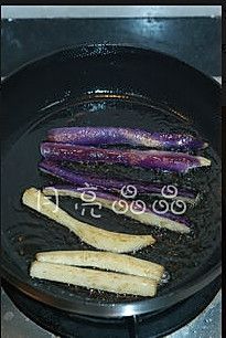锅里放油烧热(跟平时烧菜差不多量的油就可以了)。吸干水份的茄条分次排入锅中,煎至茄条变软。