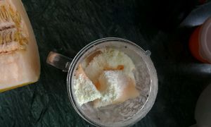 哈密瓜切块放入料理机,加入奶粉打成哈密瓜汁
