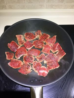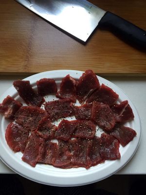 超市买来的薄切片牛排是一条长条装的,家里没有刀叉,为了方便切成这样的小块。用厨房纸吸掉表面的水分后撒一点鲜磨胡椒腌制几分钟