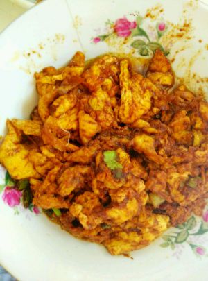 4个鸡蛋打散,一袋香其酱。热锅凉油,油稍多些,油热放入鸡蛋液,炒焦黄后放入葱花,香其酱,炒匀,出锅。
