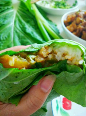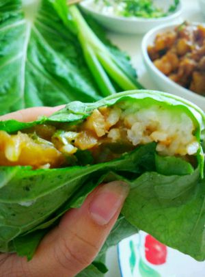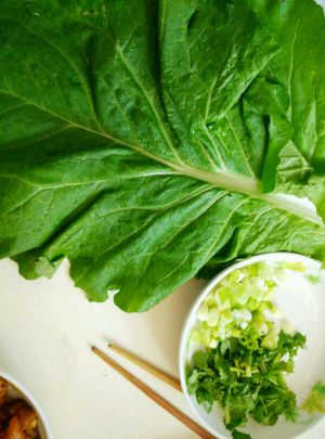 将米饭盛入碗内拌入土豆酱,鸡蛋酱,葱末,香菜末拌匀,白菜一包,上手吧,捧着开吃。
