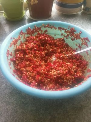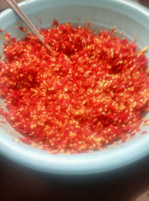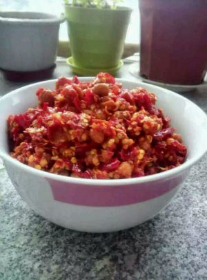 辣椒搅成碎粒,不太粗也不太细,不出辣椒水最好,可用搅拌机控制好时间,我的机器小,一回大约10秒,多弄几次就可。