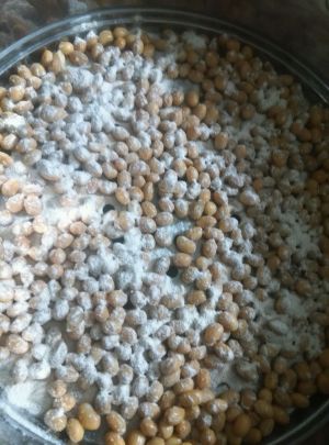 晾凉后,略带点湿气,撒上面粉,不用太多,稍裹住豆粒就可以