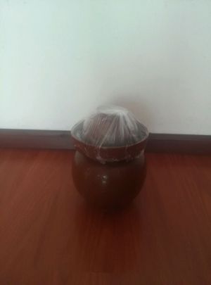 里面口封了三层膜,槽口注水隔绝空气,几天换一次水,外面再封了一层扣紧。白天可在阳光处,夜里搬进来,应该一月半就好,我的约40天
