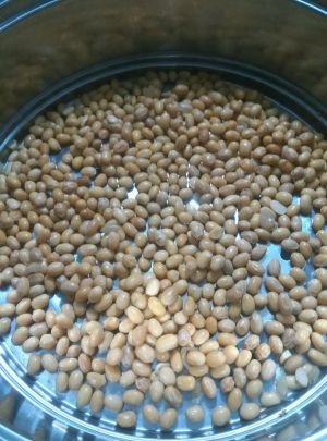 黄豆清水泡发六七小时后上锅蒸熟,摊开晾一会
