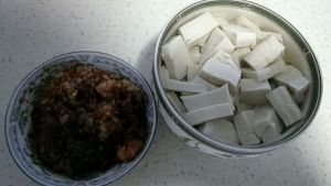 豆腐切小块,肉剁成沫,放生抽,酱油腌制10分钟左右。