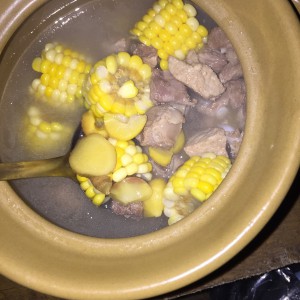 排骨抄掉血水后洗净放入砂锅内加入玉米和姜片在加入山泉水大火烧开