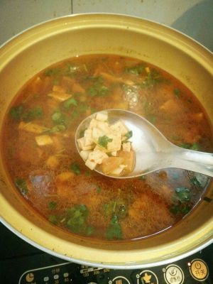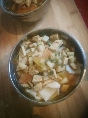 汤,土豆切丁,豆腐切丁,葱蒜放油憋香,先炒土豆,多炒会儿避免土豆味,再炒豆腐放盐入味,中途放西红柿,最后放香菜,,,