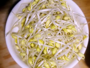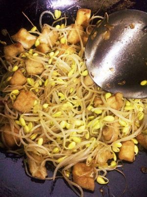 油豆腐两面微黄时放豆芽与干红辣椒,放些盐炒匀,加入一些料酒,由于豆芽与油豆腐都是豆制品,放些料酒能去豆腥气。