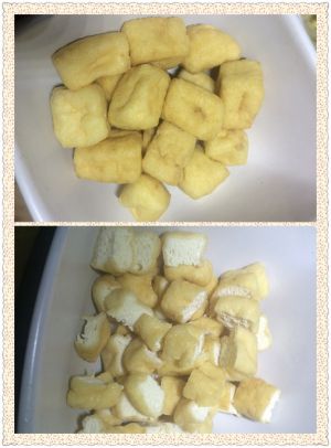 油豆腐热水洗干净,用手挤于水份,切成小块。