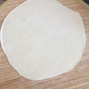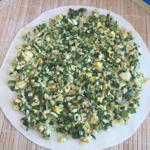 拌好馅儿加入盐和十三香搅匀 平铺在圆饼上
