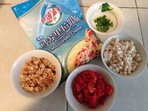等待面团发酵的时间,我们来做披萨酱和其他准备工作。将马苏里拉芝士从冷冻室里取出,放置常温下解冻。番茄,杏鲍菇,肉丸,辣椒切成0.5CM大小的块。锅烧热,放少许油,将青椒放入锅中爆炒下迅速出锅。同样的方法将蘑菇放入锅中,加少许盐炒一小会儿,注意炒蘑菇不要放油,直接干炒,会有水份出来,炒干水分即可出锅。