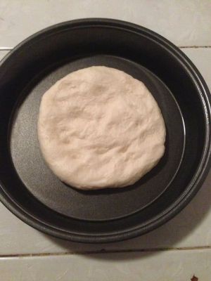 把醒好的面团压扁后放入披萨盘中,用手慢慢擀开。