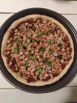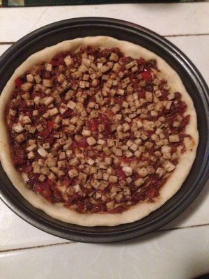 将熬好的披萨酱均匀的抹在饼皮上,再撒上蘑菇丁。