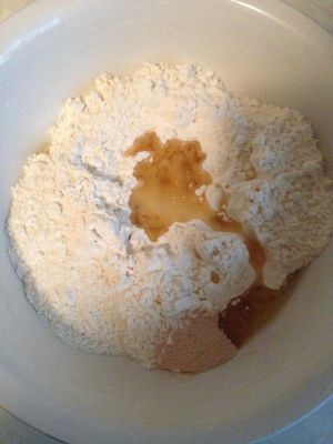 先做披萨饼皮,将主料中的面粉,油,盐,酵母放入揉面盆中。注意盐和酵母要分别放在2边,以免影响酵母的活力。很多人说揉不好面,这里告诉大家一个小窍门,用筷子将面搅成絮状后再手揉成面团。具体方法如下: