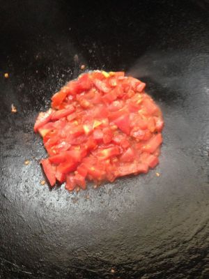 锅用大火烧热,放油,姜蒜末,炒出香味,加入番茄丁翻炒。