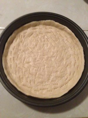 用叉子或牙签在饼皮上戳上小眼,以便烤制中饼皮膨胀排气。戳好后,将饼皮放入烤箱,上下火160度烤5分钟。
